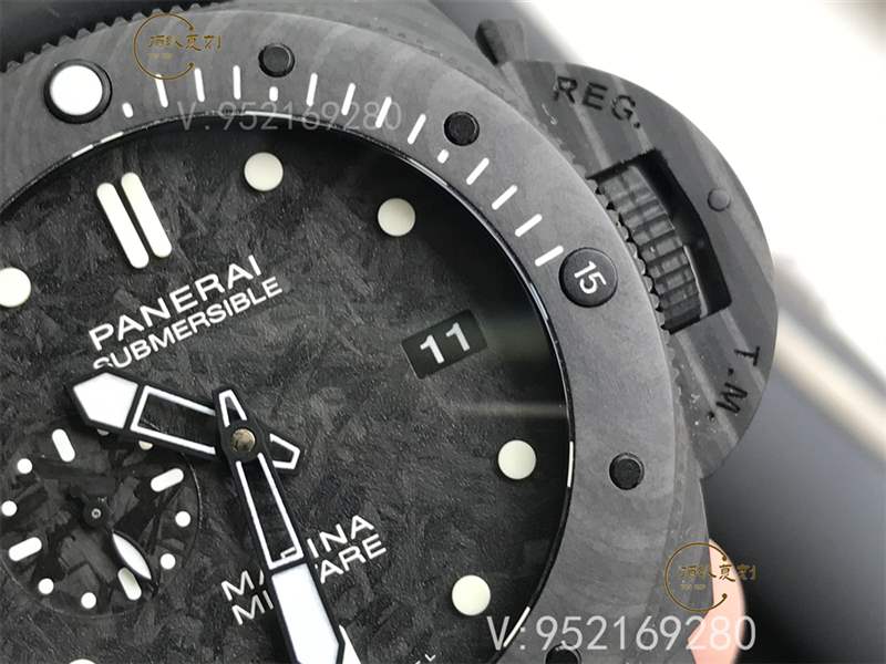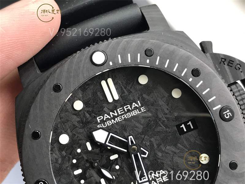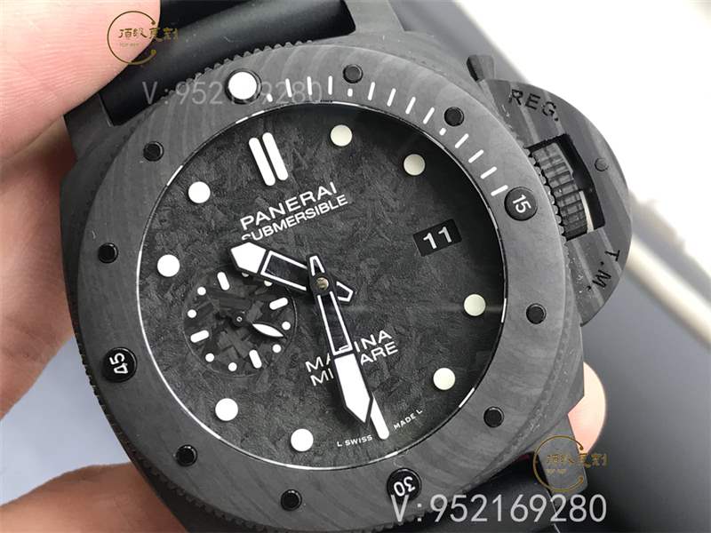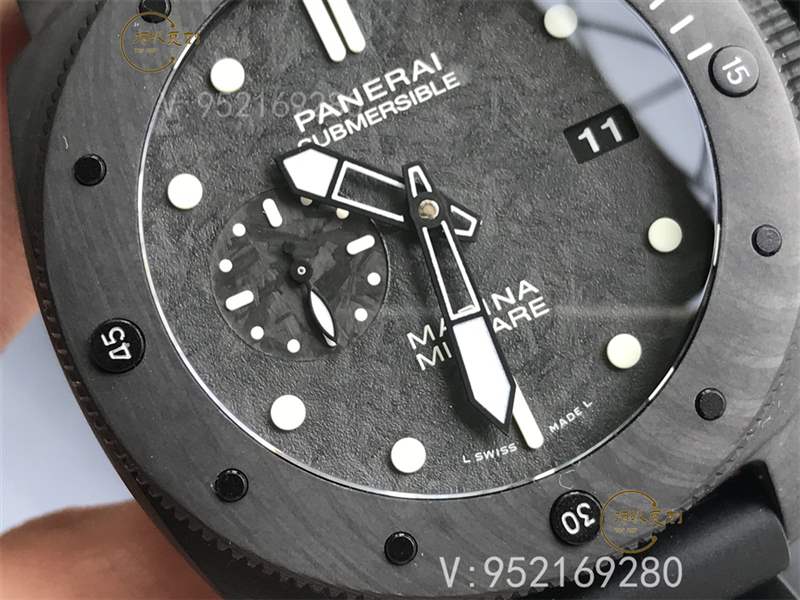 VS廠沛納海PAM979,字面是采用了碳纖維的字面,這是沛納海第一個使用這種字面,全文由兩塊碳纖維材料制成(九點是小秒盤)。這種帶有碳纖維外殼的碳纖維看起來更有科學(xué)和技術(shù)感。仔細(xì)看一下表盤、藍(lán)寶石玻璃鏡的細(xì)節(jié),這種材料不必說,玻璃的通透性和耐磨性也是可能非常的高的,外圈是可單向旋轉(zhuǎn)的,表圈上印有縱向線的碳纖維啞光質(zhì)地,表圈上的藍(lán)色夜光明珠完全對應(yīng)盤尺度的顏色。圓盤刻度上充滿了夜光涂層,而鏤心劍形時針和分針設(shè)計也填充了夜光涂層。方便夜間清晰閱讀時,在3點位有一個日歷窗口,框架的形狀與正品的一致,日歷字體也沒有不同。9點是一個小秒盤的設(shè)計,它也是一個像979這樣的雙色夜光。