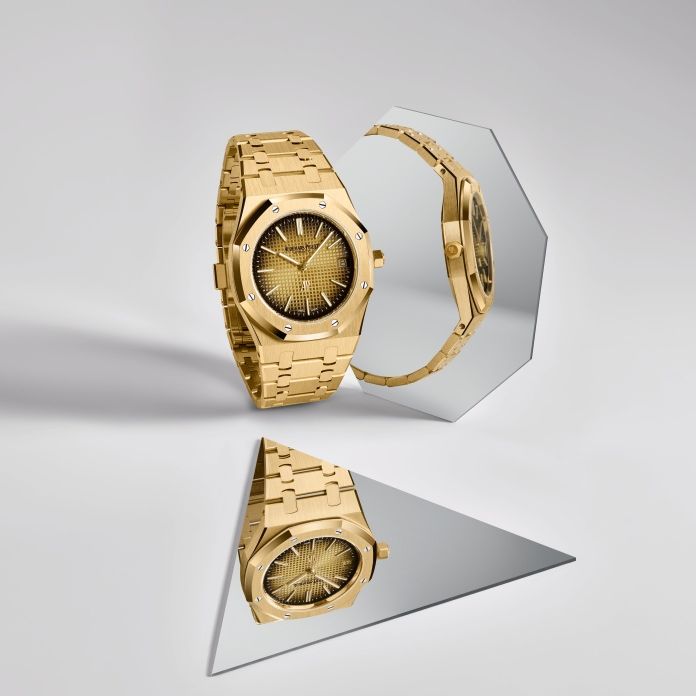 Royal Oak皇家橡樹系列「JUMBO」超薄腕表,39mm,18K黃金表殼,煙熏金色表面鐫刻「Petite Tapisserie」小型格紋裝飾圖案,搭載7121自動上鏈機芯,小時、分鐘與日期指示,Audemars Piguet。