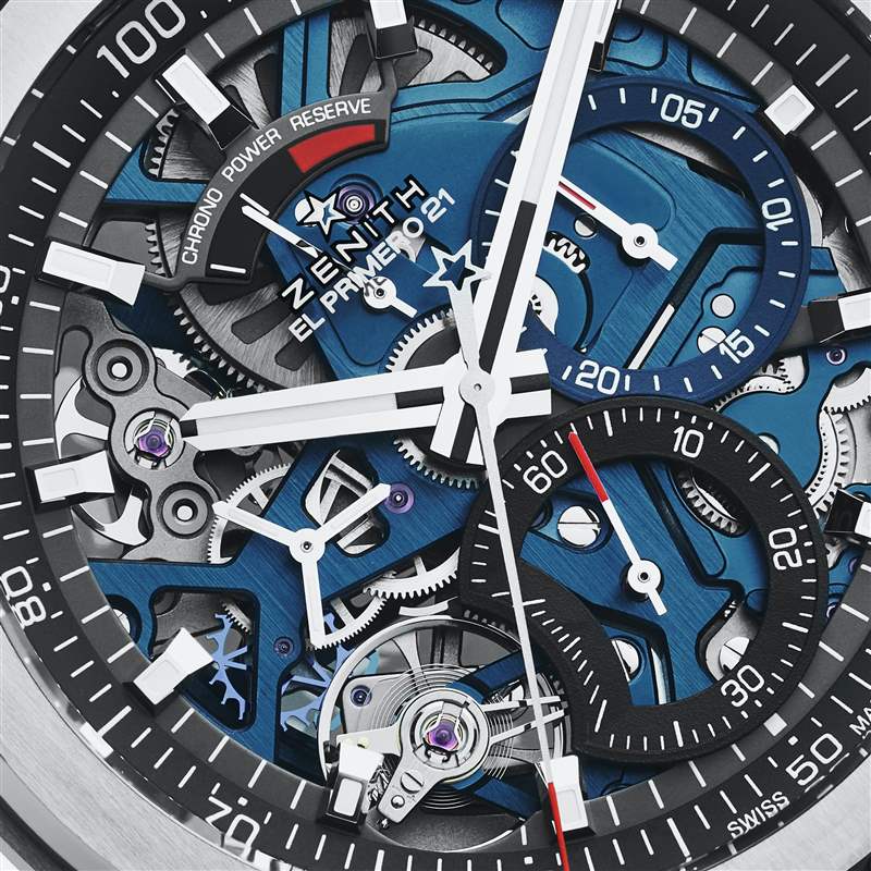 真力時Defy 21采用了第二個齒輪系,帶有高頻擒縱機構,運行速度為360,000 vph或50 Hz,以及第二個主發條盒。手表的正常計時部分類似于傳統的El Primero,其頻率為5 Hz,即36,000 vph,然后是機芯的輔助秒表特定部分,該部分是隔離的,因此它不會從基本計時機制中消耗能量。