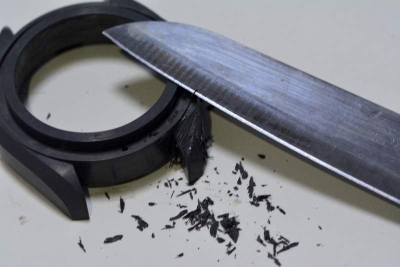 然后注塑成型:把搭配好的原材料攪拌成陶瓷漿料到機器里面注塑成型,然后需要用上百噸的液壓機壓縮成型。這道工序是非常的重要,如果原材料粉末有雜質、陶瓷漿料配方比例不對、壓縮的力度和時間長度,都可能導致粗胚在燒結過程中出現很多的沙孔、裂痕,直接為廢品。非常多的不確定因素,導致了陶瓷的不良品率是非常高的。第一次高溫燒結:陶瓷粗胚要經過1400多攝氏度熔爐內等離子高溫燒結,陶瓷會收縮硬化。第一次高溫燒結后的殼身已經變硬了,手感有點像厚重塑膠的感覺,材料的變化真的很奇妙。為了跟大家說明陶瓷殼不存在掉色的情況,特地找來了切水果用的刀子。用力的殼耳的地方,削下來了一些黑色碎末,可以看到削下來的粉末和殼身內部都已經被高溫從白色燒結成黑色的。在這里順便說一下,VSPam441的陶瓷殼跟這款“深海之黑”的陶瓷殼的硬度是比大部分常見的金屬的硬度還要高,劃痕有可能是金屬粉末沾在了陶瓷殼上,所以用濕毛巾或者細砂紙輕輕擦拭一下就好了。