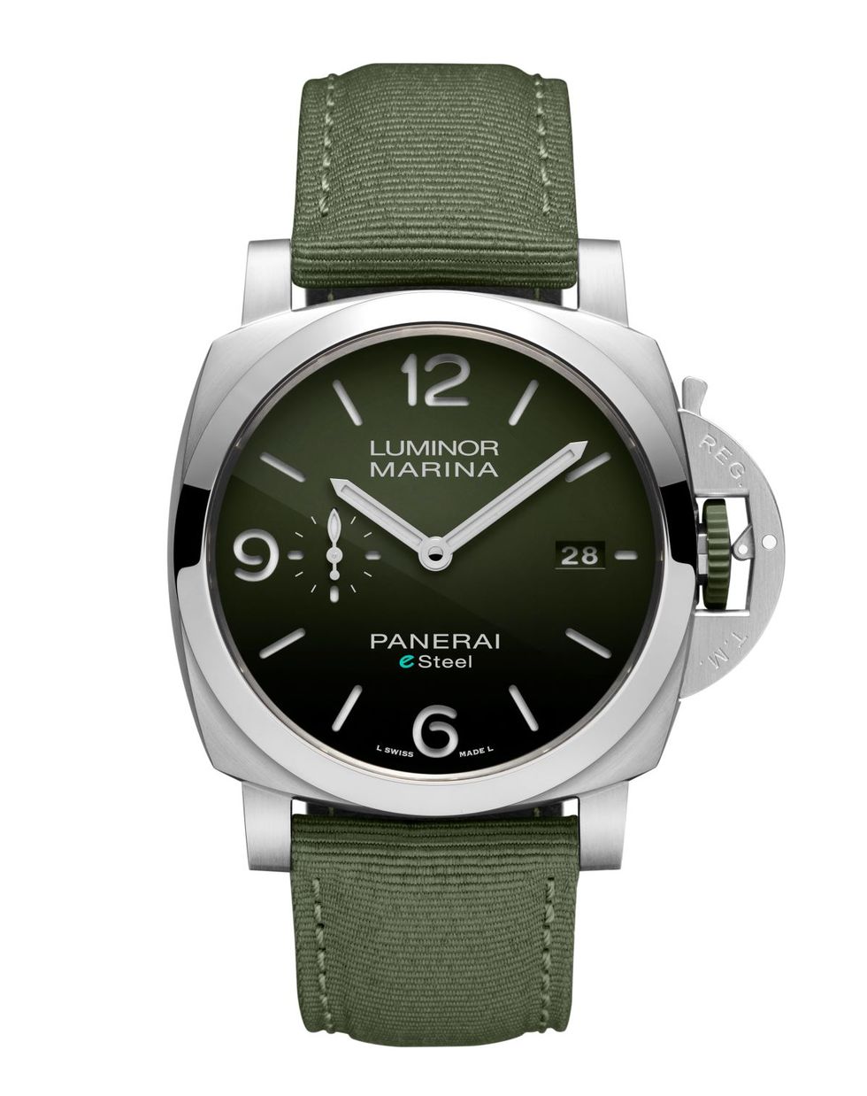 這是一款真正的「綠色腕表」!沛納海推出第一款采用「再造鋼合金eSteelTM」打造的腕表,包含表殼、表盤,以及再造PET樹酯表帶,整只腕表共有約70%重量使用環保再生物料打造的零部件。