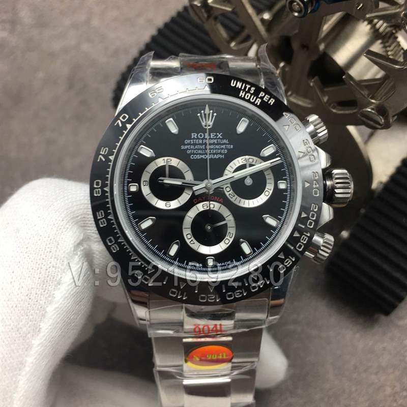 N廠4130迪通拿表徑40MM,厚度12.6MM,整表均采用904L精鋼材質,外圈采用陶瓷材質,可以說材質和殼套上基本還原了正品。迪通拿外圈是測試碼表,主要作用是為了方便賽車手在開車的時候非常方便讀數(迪通拿手表是勞力士專為賽車手設計開發的系列)。