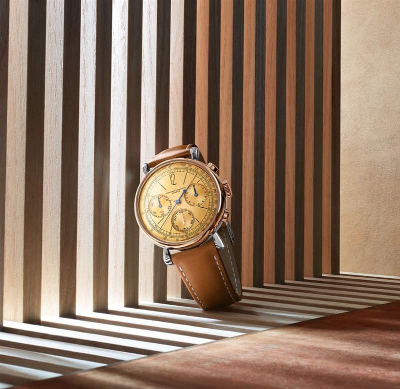 「[Re]master 01」全新自動上鏈飛返計時碼表延續了1943年原創款的重點元素,圓形精鋼表殼搭配淚滴形表耳,表圈、表冠、按鈕與時分秒針皆為18K玫瑰金。