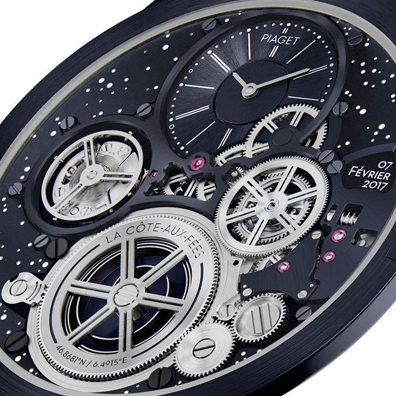 伯爵的制表師們回溯起Altiplano Ultimate Concept的誕生,生日是2017年2月7日,機芯開始運作、指針跟著走動的時間是早上7點47分,地點是在仙子坡的制表工坊La C?te-aux-Fées。制表師像接生的醫生一樣,用這些數字幫Altiplano Ultimate Concept列了一張出生證明,生日在兩點鐘位置的橋板上、表廠的所在地和座標列在六點鐘位置的棘輪,仔細看時分盤則可以看到7:47的時間用兩個空心圓點做為線索,連十二點鐘位置的PIAGET Logo用的也不是現行的襯線字體而是早期的設計。夾板這次特別以Super-LumiNova做了點狀夜光,象征Altiplano Ultimate Concept誕生那天仙子坡的星空。