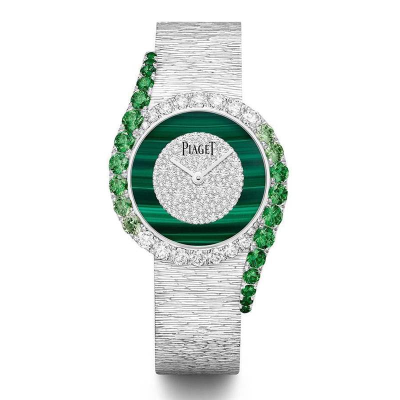 Limelight Gala也是伯爵上半年度的主力系列,雖然Limelight Gala向來都是可以素雅也可以華麗的呈現,但因為它的表殼造型力道很夠,非常適合用多彩寶石去呈現,凸顯流暢線條帶出的視覺張力,今年這款以沙弗萊石搭配孔雀石面盤的新作,就是很能烘托Limelight Gala設計特色的搭配。表殼上沙弗萊石從淺到深、由小到大的漸變呈現方式很細致,鏈帶則是伯爵擅長的宮廷式鏈帶裝飾,載在手上就像在銀色晚禮服縫制上綠色滾邊的裙擺,能隨著身體的輕擺搖曳出搶眼卻不浮夸的姿態。
