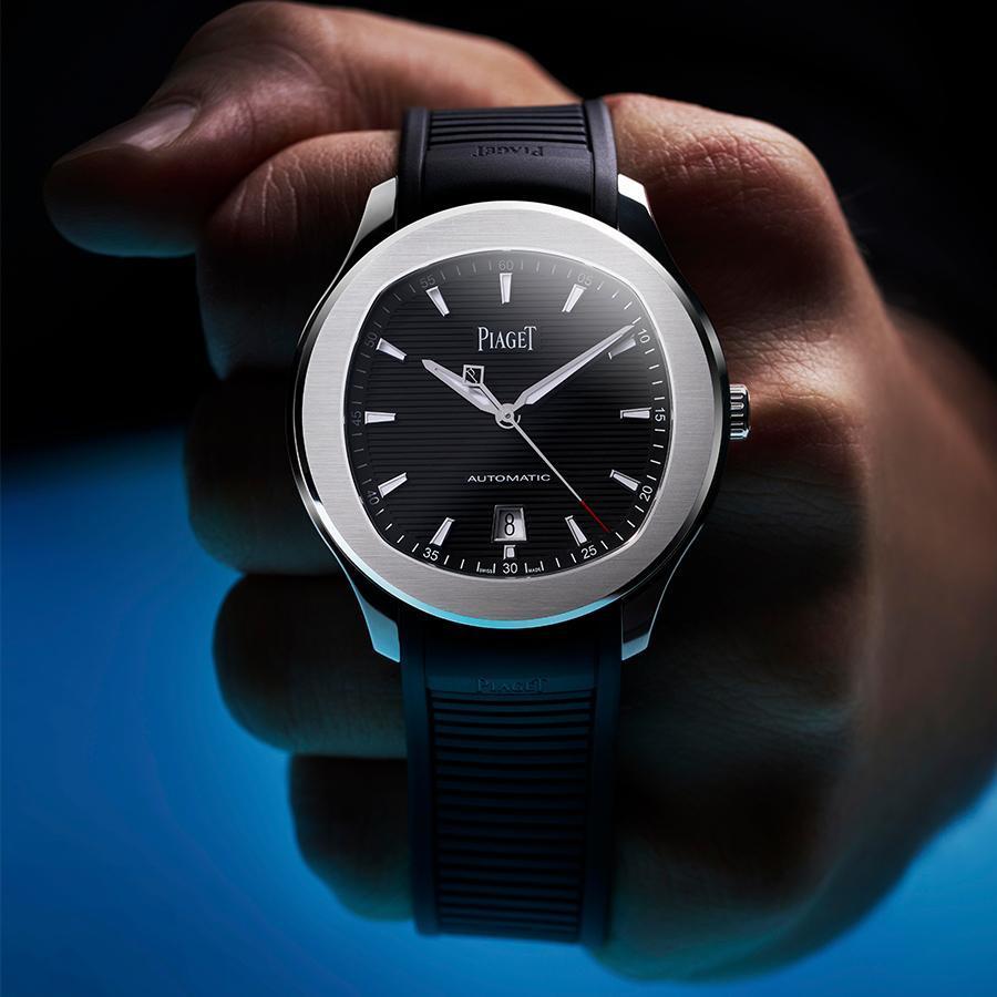 Polo一開始的路線比較偏向正裝斯文感,一來是因為款式多半是素色三針基本款或是鏤空工藝款,即便是計時碼表早先搭的也以鏈帶和皮帶為主,后續才開始出現橡膠表帶的選項。今年的黑面大三針日期版本,也搭上延續面盤橫紋的橡膠表帶看上去就像輪胎的象征,搭配秒針末端的紅色區段彰顯出競速感,表帶還加入與時俱進的快拆設計,為搭配性加入更活用的可能。