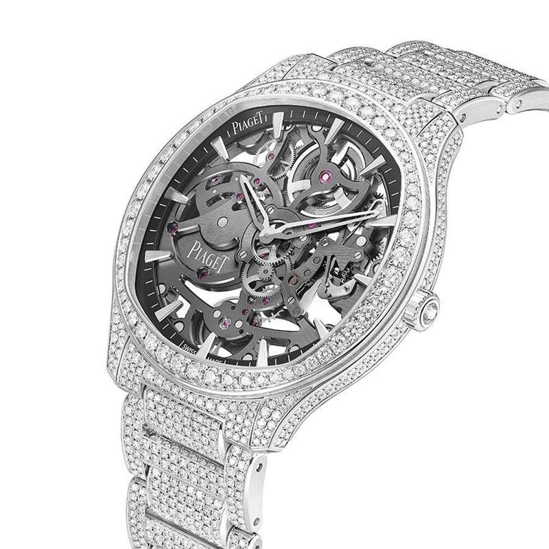 伯爵今年將Polo Skeleton鏤空款推向奢華版的路線,之前的Polo Skeleton大致上是夾板鍍色搭配表殼材質或表圈鑲鉆去做變化,而今年則是推出滿鉆版本,將表殼和鏈帶鑲滿了鉆石,搭的依舊是1200自動上鏈機芯。之前的1200幾乎都只搭在Altiplano系列,后來Polo Skeleton也開始使用這枚機芯去做變化,1200S1的S則是Skeleton鏤空的意思,將同一枚機芯針對不同款式做出不一樣的差異。