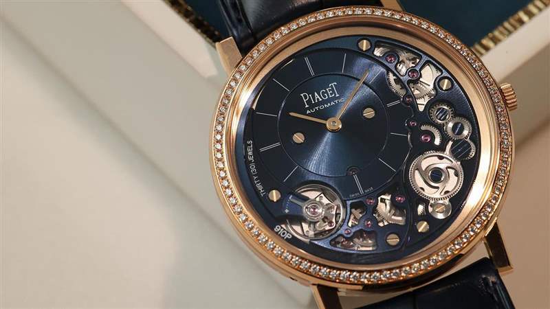 前年的時候我們介紹過這款Altiplano Ultimate Automatic,而今年伯爵則又做出不一樣的變化型態。面盤的主色調是夜藍色、表殼則是玫瑰金,伯爵以這兩個顏色將環形自動盤劃分出兩道月牙般的弧線,夜藍色和玫瑰金的對比感,讓自動盤轉動起來的視覺感更顯著,像是有彈性般的動感,用顏色和材質做出小改款的變化。
