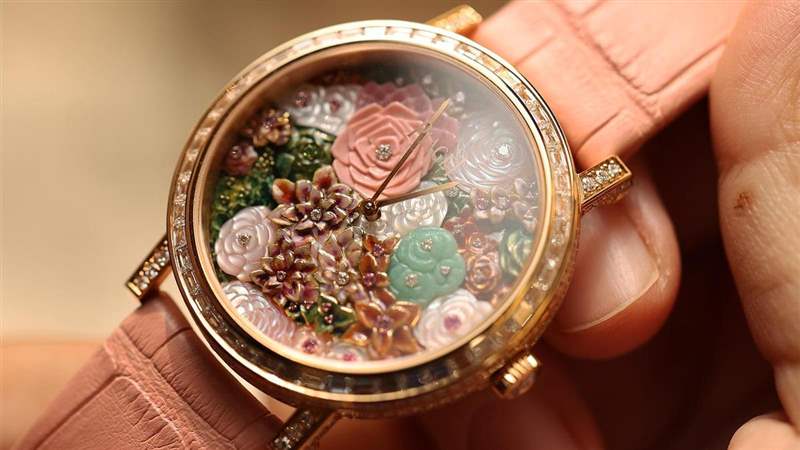 今年是伯爵玫瑰誕生的40周年,伯爵也以玫瑰為主題,推出這款集結寶石雕刻、金雕和琺瑯的Altiplano工藝表款。面盤上的伯爵玫瑰以寶石雕花和琺瑯交錯呈現,工藝上最難的部分在于要在金雕支架旁邊涂上琺瑯粉末,送進爐烤高溫燒制然后不能讓邊緣燒焦,因此非常考驗琺瑯工匠的技術功力,但因為操刀的是大師Anita Porchet本人,所以還有什么好擔心的呢。