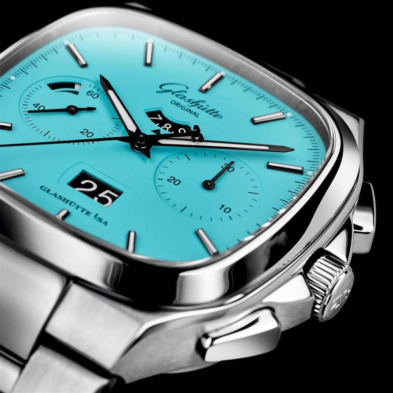 格拉蘇蒂原創(chuàng)的復古系列底下有兩條支線,Sixties有著圓潤的表殼,Seventies則是方殼帶倒角的造型,很直觀的用名稱來表達產(chǎn)品的設計靈感,其中的Seventies之所以會使用方形,反映的是1970年代電視機迅速蓬勃發(fā)展的時代背景。幾年前開始格拉蘇蒂原創(chuàng)在復古系列底下有個明顯的新品策略是「顏色」,Sixties自2018年起采用「年度限定色」的概念,至于Seventies則是制作數(shù)量稀少、顏色更大膽的限量版本,像是去年就有「日光黃」和「明艷藍」,同樣各限量100只,而且就目前官網(wǎng)來看,Seventies的作品已經(jīng)沒有黑面或銀面這類基本色的選擇。