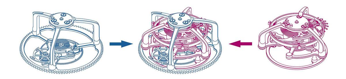 一般來說恒定動(dòng)力陀飛輪常見的作法,是在走時(shí)輪系和陀飛輪框架的中間安插恒定動(dòng)力裝置,直到IWC 2013年的94800手上鏈機(jī)芯,才出現(xiàn)把恒定動(dòng)力裝置整合在陀飛輪框架的設(shè)計(jì),GS這款Kodo的9ST1機(jī)芯也是采用相同的概念,但9ST1技高一籌的是它的振頻是28,800vph,等于每秒震動(dòng)八次,轉(zhuǎn)速遠(yuǎn)比94800機(jī)芯的18,000vph還要快上許多。