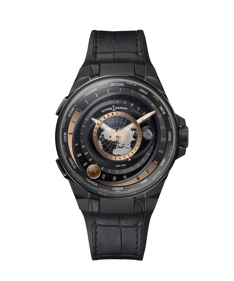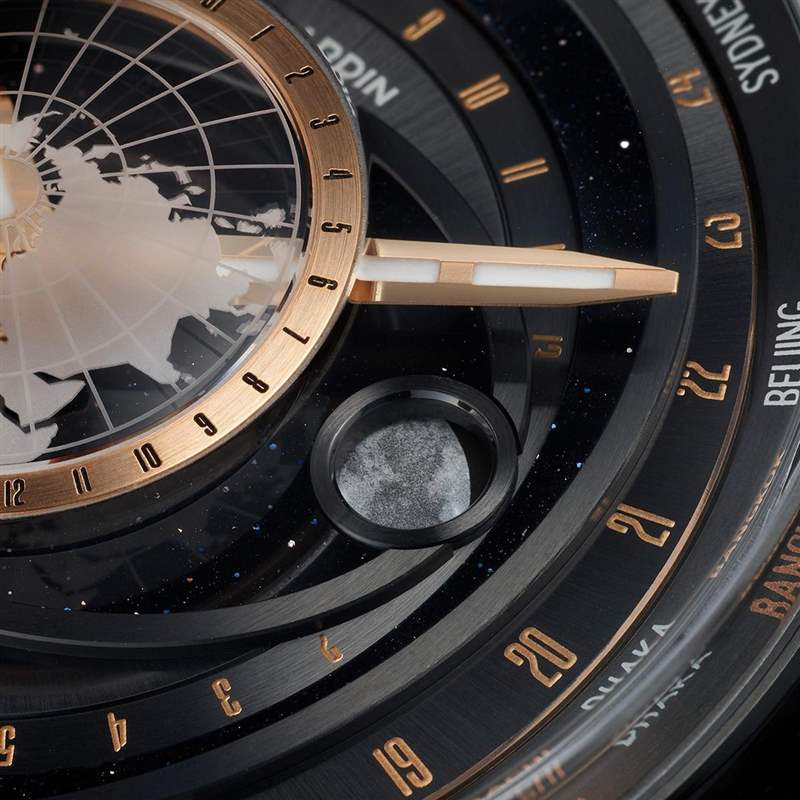 中央固定位置的地球圓盤呈現(xiàn)北半球的地圖,采用相同的拱形藍(lán)寶石水晶設(shè)計;從中心點向外延伸,中央的橢圓形部分為月亮的軌跡,每29天12小時41分9.3秒會沿表盤繞行一周,是月相變化的完整周期,再往外則是太陽,以及世界時區(qū)城市環(huán)。至于左側(cè)的兩個表冠,可以直接以小時為單位,快調(diào)主要時區(qū)的時針,快速切換時間。