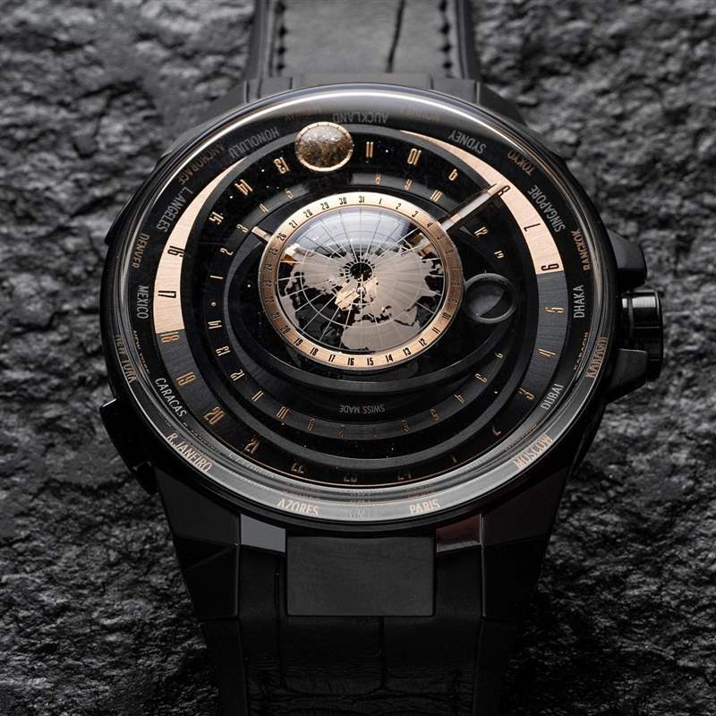 Blast月之狂想世界時區(qū)腕表的設(shè)計理念,有別于哥白尼的日心說概念,改為地心說,即是以地球為中心,標(biāo)示出太陽、月球的相對位置,其中包括日期、時區(qū)、潮汐系數(shù),以及當(dāng)前月相狀態(tài)都會彼此連動。