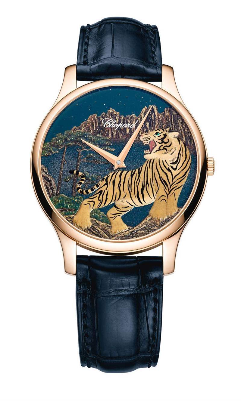 - 江詩丹頓「藝術大師」年度生肖表,是收藏家每年必收的作品。今年的虎年表,有玫瑰金與鉑金二種款式。其面盤融入多種工藝,先手工雕刻花葉裝飾圖案,再以半嵌入式方式將深淺不同的浮雕組出層次,使之有如懸浮于表盤上,覆上大明火琺瑯,再鑲上手工金雕的「老虎」。立體感分明,老虎的神情有種特殊的韻味。各限量12只。