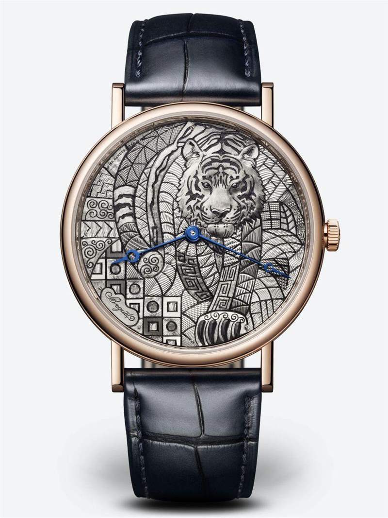 - 寶璣今年推出集「機刻雕花」與「鐫刻工藝」于一身的虎年限量作品,同時融合寫實與抽象風格,仿佛看得到老虎在面盤上從容行走的畫面,展現某種神秘力量,更有王者之姿。這種工藝的困難度在于,虎頭以浮雕細膩描繪,但其他部位則以方格組成,再飾以機雕紋路與符碼圖騰構成虎身。而要在如此微小的方格中,進行深淺不一的機雕操作,其細膩程度叫人嘆為觀止。全球限量僅8只。