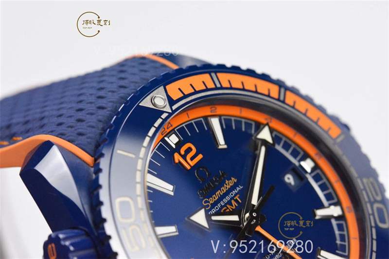 VS廠這款45.5毫米的碧海之藍,配備藍色陶瓷表盤和橙色GMT指針。腕表的指針和小時刻度由白色18K金打造而成,表面覆以白色Super-LumiNova夜光涂層,令藍色表盤閃耀迷人光澤。藍色陶瓷表圈上飾有以OMEGA Liquidmetal?技術精制而成的潛水刻度,前15分鐘的刻度以獨特的橙色橡膠裝飾,于陶瓷材質上更顯明亮醒目。