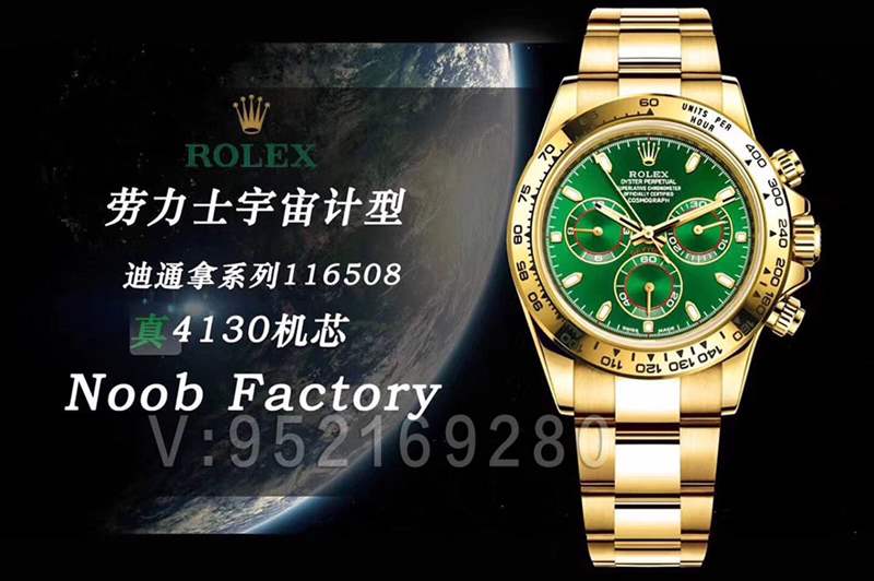 以下是N廠官方的宣傳資料:N廠十月重磅巨獻~~勞力士宇宙計型迪通拿116508!!綠金迪!! 原版一比一開模,40毫米尺寸,採用N廠獨家真正4130機芯,這是一款穩定計時功能機芯,并且達到厚度與原裝一致,完成完美的復刻!! 另外外殼沿用904l精鋼鑄造配以2N18金電鍍,顏色更突出,光澤更明亮,與18k黃金更接近! 表冠以旋入式三扣鎖三重防水系統,防水更嚴密!! 加上鏡面採用高亮度藍寶石玻璃,原裝隱形麥頭,蠔式保險摺扣配5毫米易調鏈節伸展系統,組合出N廠最新神器!