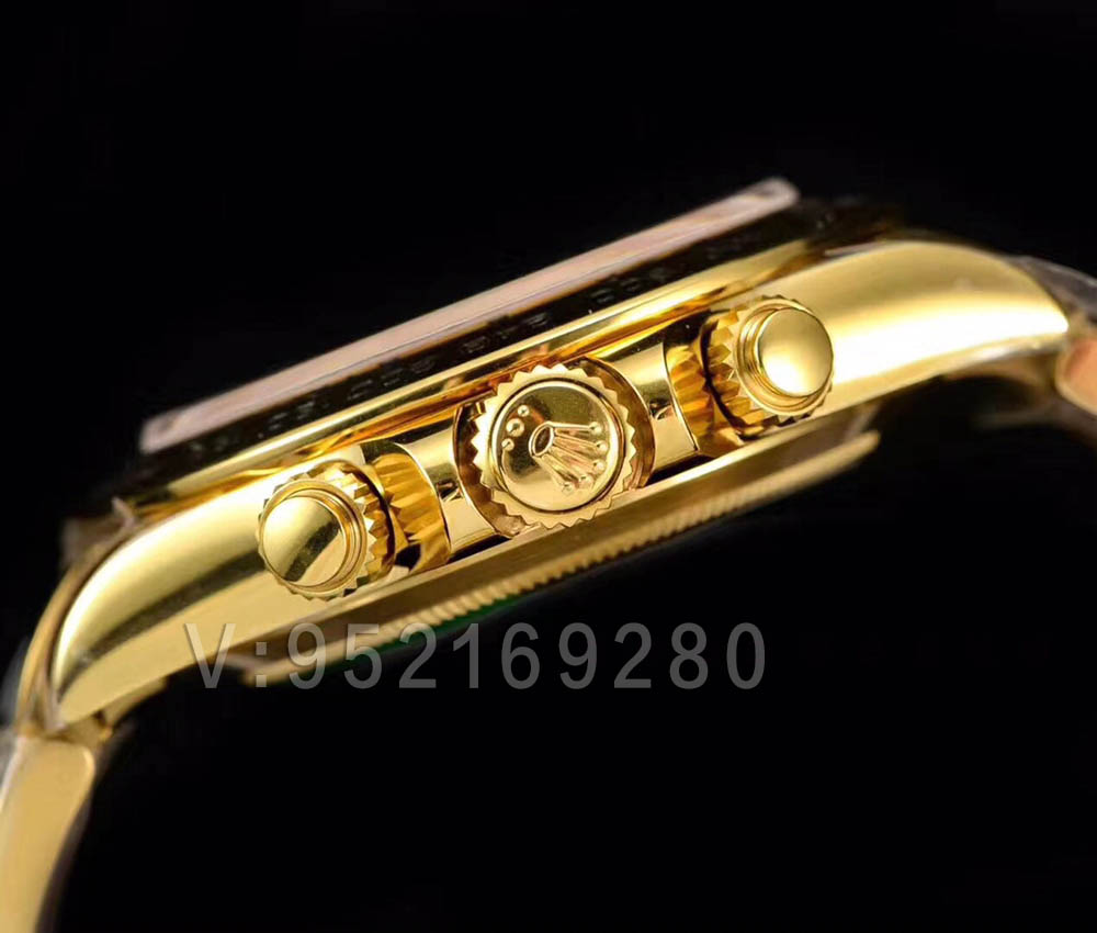 側面是有3個把頭,有上到下依次為計時開始/暫停,調時間以及計時復位!三枚把頭都是采用旋入式把頭,擁有超高的防水效果。由于搭載N廠4130機芯,此款綠金迪厚度和原版一樣,這個也是N廠稱霸迪通拿的頭號招牌!市面其他廠基本上無法做到的!