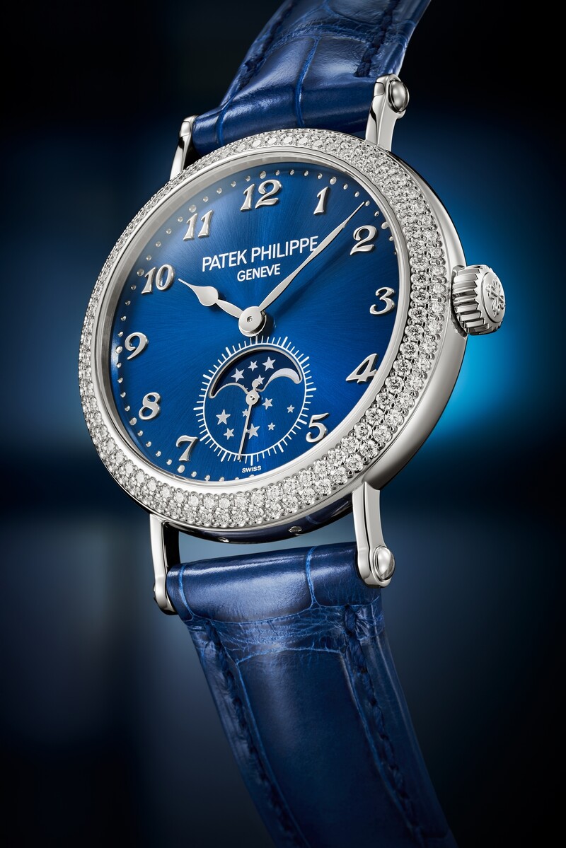 月相表向來PP百達翡麗經典女表最受歡迎的款式之一,Ref.7121從2013年開始推出,2022年新款女表以18K白金搭配深藍色表盤呈現,呼應月相、星空主題,表盤裝飾獨特的日輝紋,與表圈雙排行明亮式鉆石的Dentelle蕾絲工藝相襯,內在搭載PP最小巧的復雜功能215?PS LU手上鏈機械機芯。