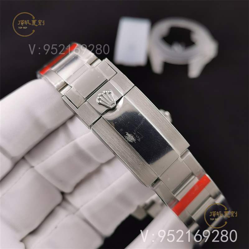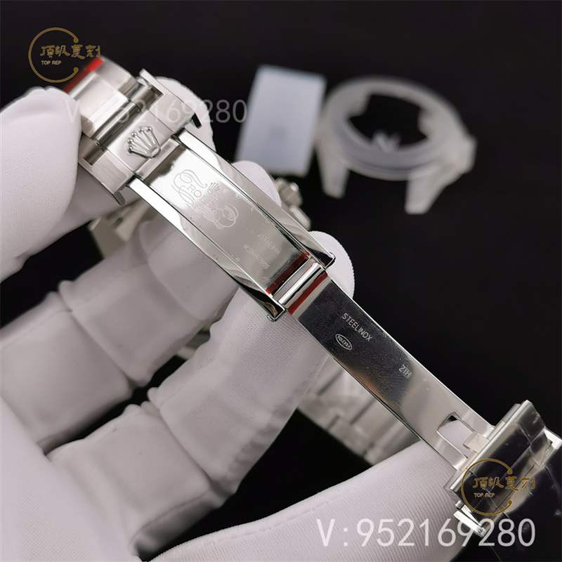 表帶同樣采用904L鋼打造的精鋼表帶,經過雙邊拉絲,中間拋光處理。折疊扣內側的雕刻跟正品完全一致。表帶的微調功能讓你調節到更適合自己的手腕大小。