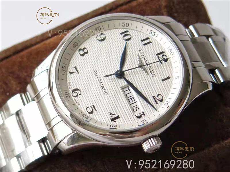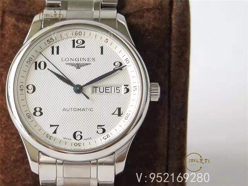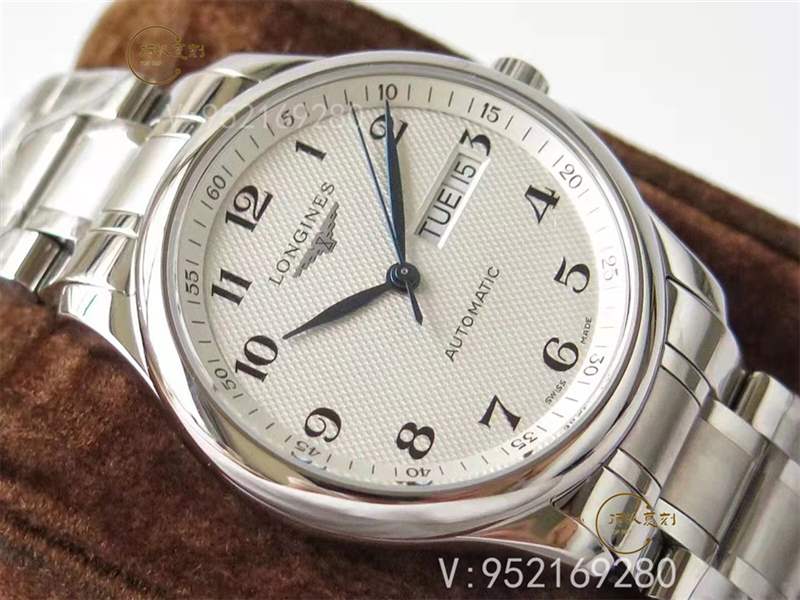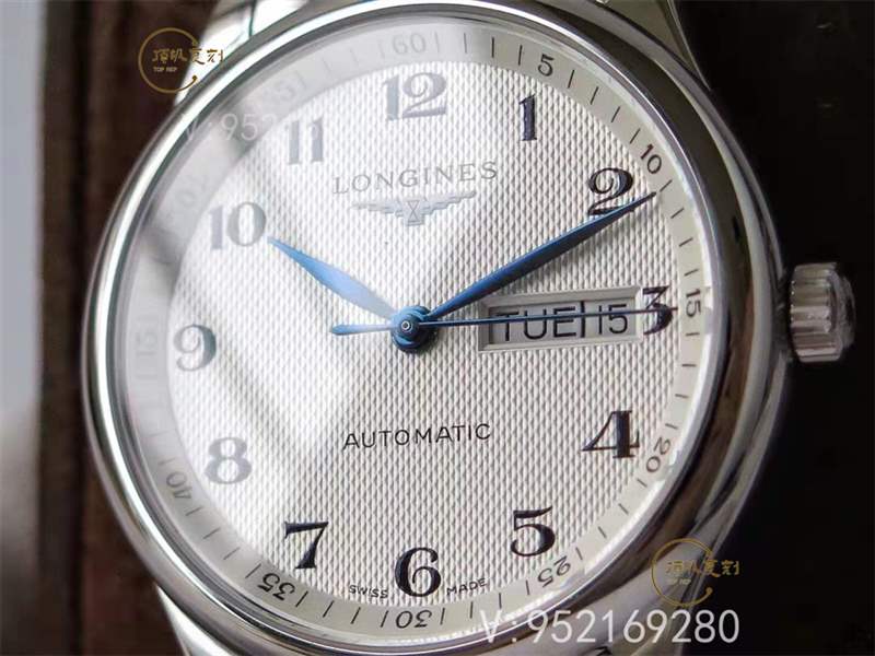 在沒有對比的情況下很難發(fā)現(xiàn),下面這款是其他客戶定制的同樣機芯不同外殼的浪琴名匠,因為是組裝,我安排師傅選擇的是燒鋼藍(lán)色指針,不過市場能夠買到的最好的指針雖然顏色對,版本不對,指針的長度不夠。盤面上logo處L下方有小洞,有興趣的朋友可以找我要大圖。再就是以阿拉伯?dāng)?shù)字6為例,正品包括KZ廠浪琴的收尾都是很細(xì)致,而其他版本的這個數(shù)字我們看到尾巴粗細(xì)不一,所以說,就算是機芯一樣KZ同樣勝出。