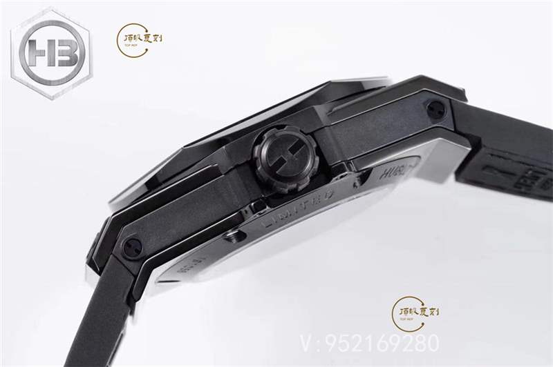 幾何形狀的布局引發男人大腦的思考,六邊形的表殼設計已經大大區別于其它手表了,僅這點就已經很特別了,宇鉑BIGBANG 表殼采用316精鋼鍛造成型,腕表尺寸45mm, 厚度14mm,貼合度極好,表殼全程CNC打磨 側邊塑膠黑色片。指針為異形拋光指針,表殼全數控磨邊塑料黑色板材。邊角采用了切割和打磨的工藝處理,質感還不錯。