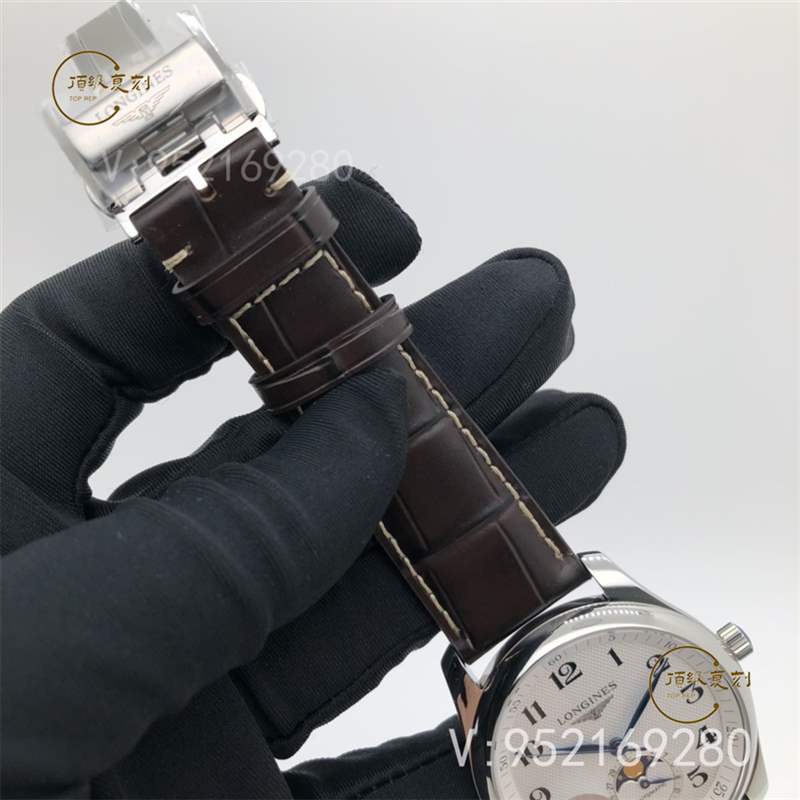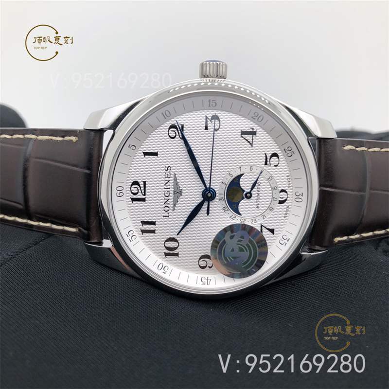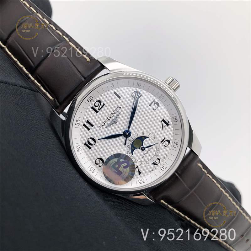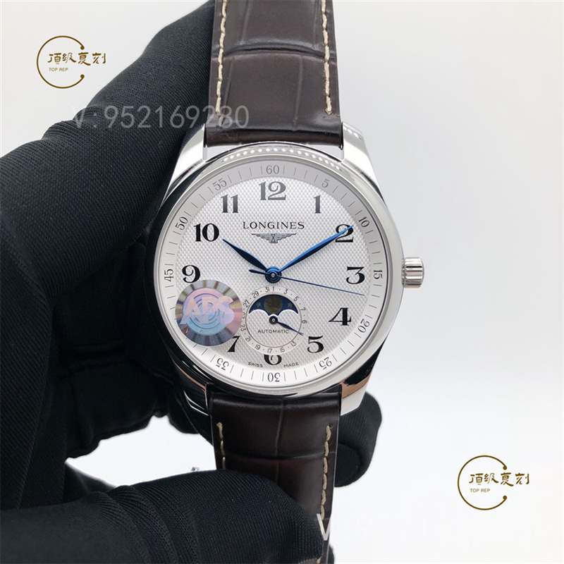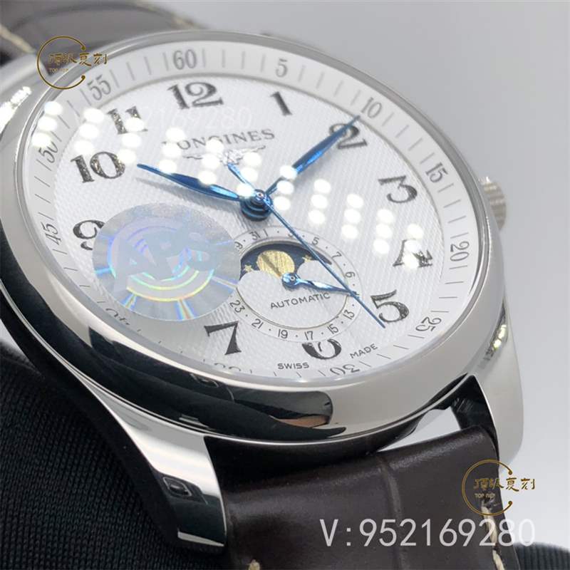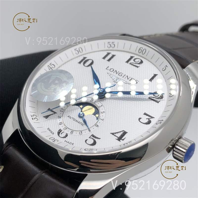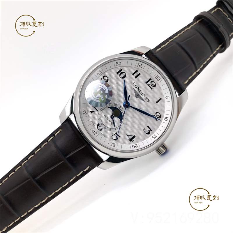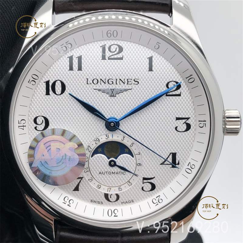 APS廠新品浪琴名匠系列L2.909.4.78.3月相腕表壓軸登場!腕表尺寸40X10毫米。表殼尺寸工藝完美復制原裝工藝柳葉形藍鋼淬火表針,針型和工藝均同步正品。機芯采用一體L899機芯,真軸承并非貼片機芯,并帶有精磨日內瓦紋機芯功能與原裝一致,真月相一月一圈記錄月亮的軌跡。