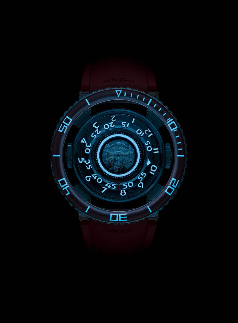 這是一次徹底的整容,將黑暗的 Aquapod 徹底轉變為更明亮的東西,但這并不是新手表的全部。以前的 HM7 依靠旋轉環和轉移數字來告訴時間,這個版本依靠浮動鈦數字。