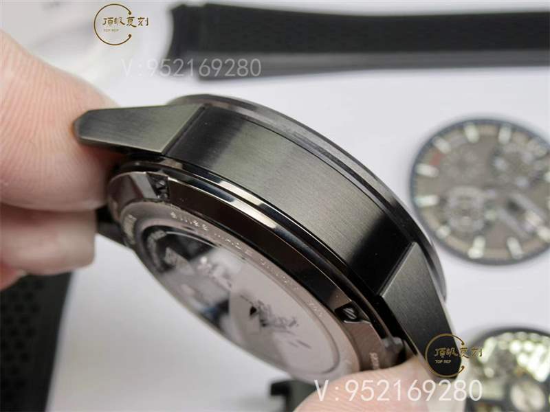 三點位置設置日歷窗口,9時位置設有深灰色噴砂小秒盤,12時位置設有深灰色噴砂30分鐘計時盤。我們可以清楚的看到刻度的清晰拉絲以及指針的干凈程度,盤面的噴砂工藝非常具有工藝性質,復刻的相對來說要差一些。