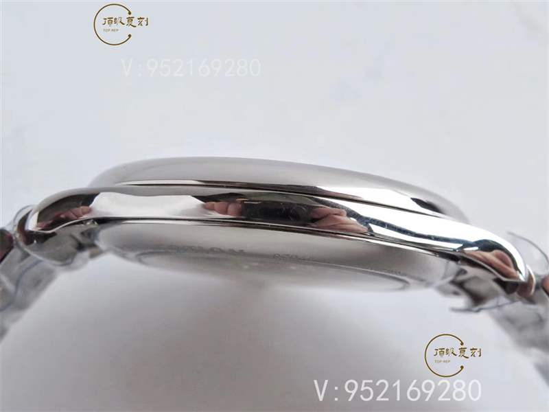 此次重新矯正表盤,盤面顏色以及麥穗壓痕清晰整潔。整體的效果并不下于正品。工廠宣稱整表配件支持和正品完美互換,這個我覺得還是有點夸張,把頭,表帶,表扣是可以做到與真表互換。圓形的銀白色表盤,以麥?!憋椉y裝飾。紋路清晰,干凈整潔;燒鋼藍指針,低沉的藍色,針體飽實與白色盤面交相輝映;所有的盤面細節入眼都是精致。