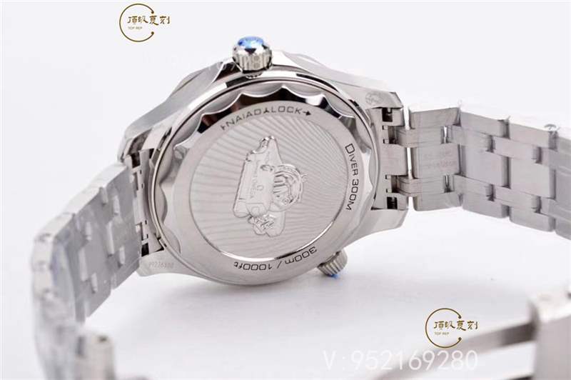VS廠歐米茄海馬300游艇Nekton特別版的底蓋圖案采用拋光和拉絲工藝相結合,層次感十足,腕表表背鐫刻有“NAIADLOCK, DIVER 300M”以及防水深度等字樣,并飾以Nekton潛水艇樣式徽章。說心里話看過實物后我覺得這款底蓋圖案不是一般精美,是十分的精美!簡潔、精致、高效,能做到這個級別復刻做工市場不超過幾家。