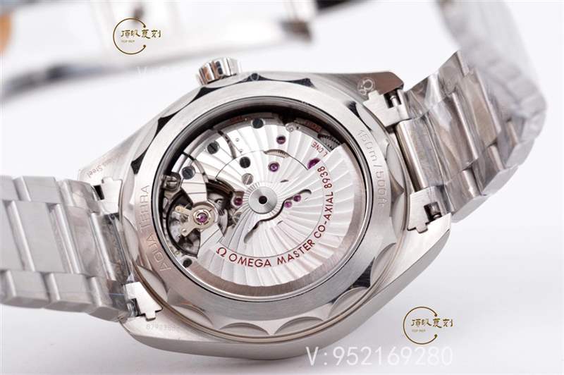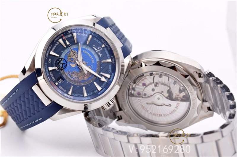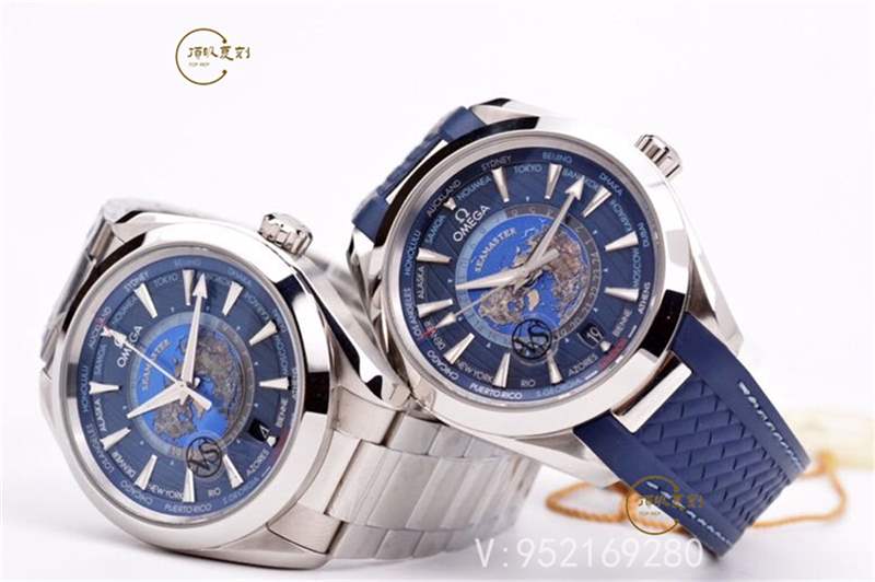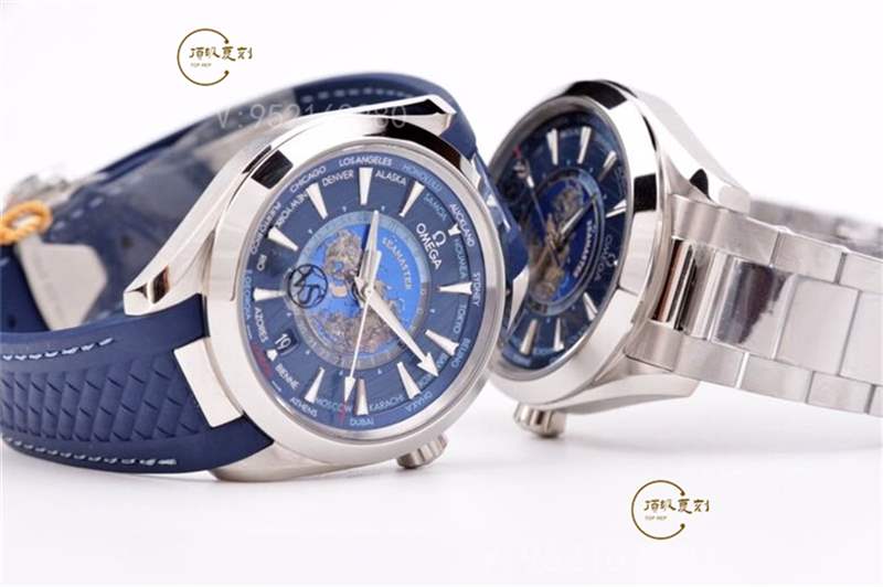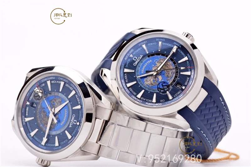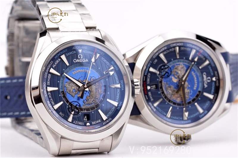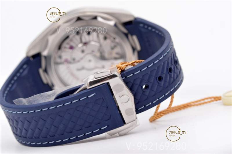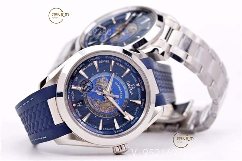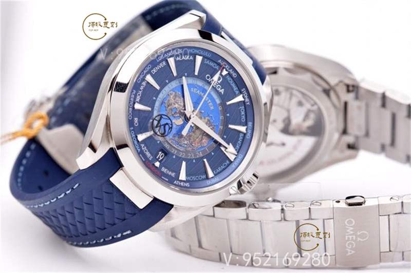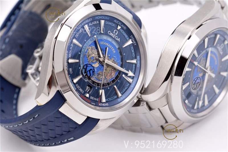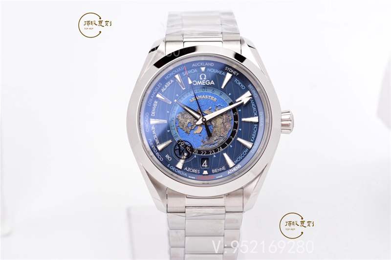 表盤,藍色太陽紋飾表盤采用Aqua Terra經(jīng)典的垂直柚木紋理,表盤周圍環(huán)繞著世界各地的不同城市,分別以紅色(?GMT時間地區(qū)?)?、銀色(?夏令時間地區(qū)提前1小時?) 或藍色(?不設(shè)夏令時間?)印刻地名?。這個盤面比較復(fù)雜,VS廠盤面中間海洋部分采用激光燒蝕工藝,陸地采用浮雕工藝,與正品的工藝大致是類似的,24小時hesalite水晶環(huán),歐米茄的金屬標(biāo)志以及契形刻度在細節(jié)的處理上保持了一貫的高超工藝,這款表盤工藝非常復(fù)雜,畢竟涉及到的顏色較多,工藝以及盤面的部件復(fù)雜,但是VS能做到精致確實不易。外圍采用垂直柚木紋理同步了海馬150,在藍色上為深藍色色差很小,大家對比正品的深藍色可能覺得誤差不小,但是這個藍色因為光線的問題,在不同光纖線呈現(xiàn)的視覺感受是不同的。在海洋藍色方面老馬覺得還是略微有些不同,不過復(fù)刻表,窮究其細節(jié)是沒有意義的。