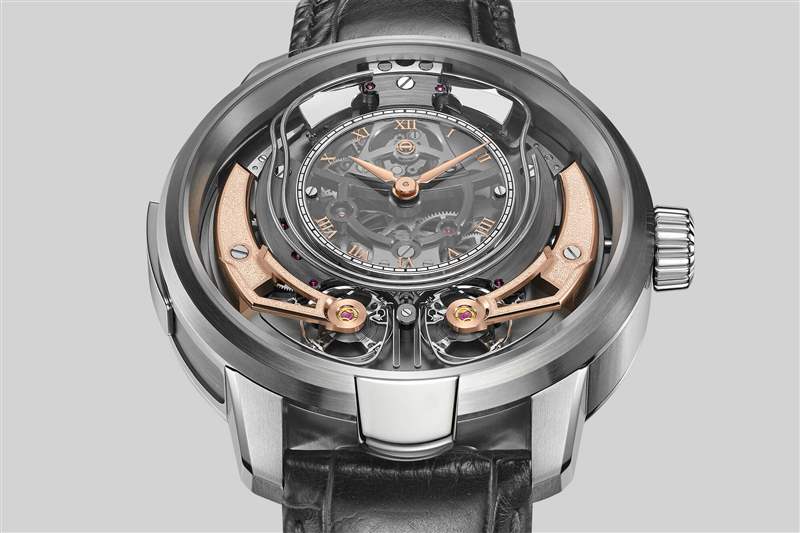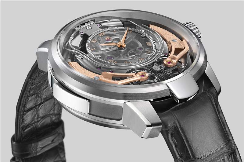 靈感來自伯爾尼著名的塔鐘,但這是一個嚴肅的推斷。47.7 毫米的鈦金屬表殼很大,但考慮到其內部結構,這是可以理解的,而且超輕金屬使它更耐磨。該直徑還允許更大的聲音傳播,因此,當您使用外殼左側的滑塊激活這對錘子時,您不會錯過鐘聲。