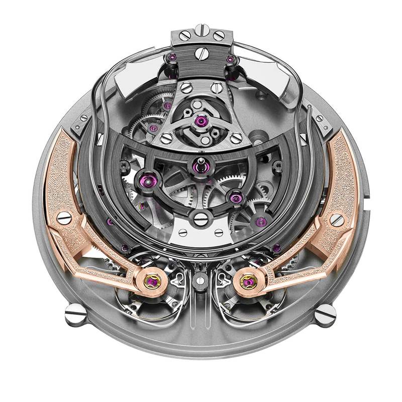 這款鐘表杰作中的所有東西都翻了一番。有兩個獨立的動作,堆疊在另一個之上;單個發條盒中的兩個獨立主發條和兩種共振形式。這是世界首創的原因;除了阿明·斯特羅姆,沒有人會瘋狂到足以解決這個問題。