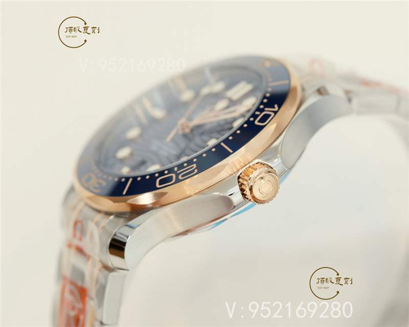 OR廠海馬300M間玫瑰金藍盤復刻腕表采用的是一個電鍍玫瑰金的設計,所以說相比較純鋼亮面的材質來說氧化程度是要大的,佩戴時間久了顏色會暗淡,42毫米的外殼,材質316鋼搭配上玫瑰金的設計非常的亮眼!腕表整體呈現出的視覺觀感還是非常不錯的,看起來非常的精致,很有質感。感興趣的表友不妨入手把玩一番!