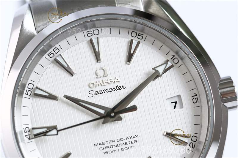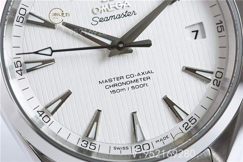 盤面,鏡面藍寶石,保證了腕表通透性的同時,也具有一定的耐刮特性,這個角度我們可以清晰的讀懂表盤。豎紋柚木紋理清晰,白色讓整個表盤看起來非常整潔,紋路底部都有加工處理,看上去整齊劃一。歐米茄金屬標志平面拉絲,平整細膩,可見下圖。這里很多小廠是拋光的。字面上的刻度紋理也是非常具有立體感,簡單的大三針設計,小時刻度、時針、分針及計時秒針覆有白色Super-LumiNova夜光層,這里VS的夜光同樣是進口夜光涂料,黑暗情況下夜光顯示明亮,同時字面條釘拉絲干凈整潔,質感優良。