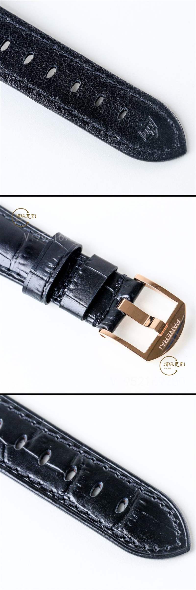 - VS廠沛納海908腕表的表帶采用黑色小牛皮材質(zhì),以黑色縫線以及大塊格紋進(jìn)行了裝飾,另外還可以定制鱷魚(yú)皮帶方便消費(fèi)者選擇。腕表的針扣采用金屬材質(zhì),佩戴起來(lái)很方便,簡(jiǎn)單舒適。
