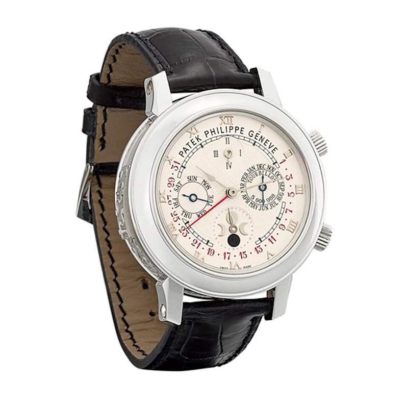 除了強大的功能,在外觀設(shè)計上也極為精美,表殼由最貴金屬鉑金鍛造而成,表殼上刻有迷人雕刻,乳白色表盤上壓印有Calatrava十字扭索飾紋圖案,由于有兩面表盤,所以亦有兩個表冠,4點鐘表冠用于設(shè)置時間和上鏈,而2點鐘表冠則專門用于表殼背面的表盤,可以從一個方向校正天空圖和恒星,以及在轉(zhuǎn)向另一個方向時校正月球顯示的位置。是次拍賣將會在10月5日假香港會議展覽中心舉行,除了以上這枚終極頂級收藏,亦有Tiffany & Co.發(fā)行的「Nautilus 」系列、百達翡麗的三問、正裝腕表、不同獨立制表大師的創(chuàng)新設(shè)計等等,迎合不同藏家的需要和口味。