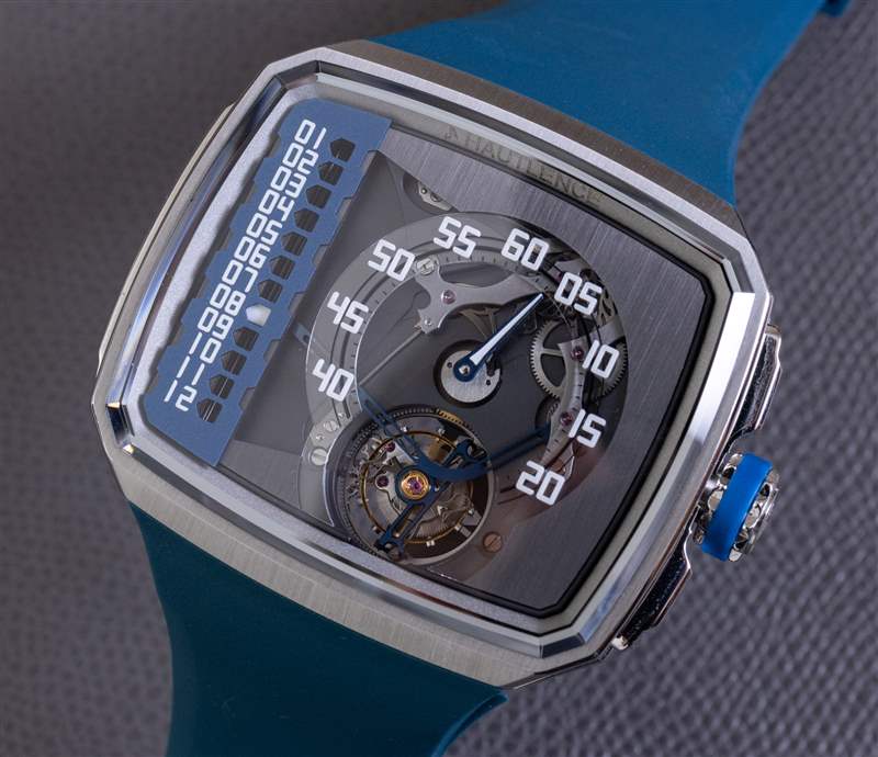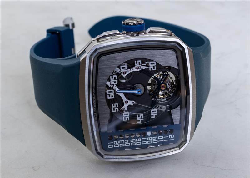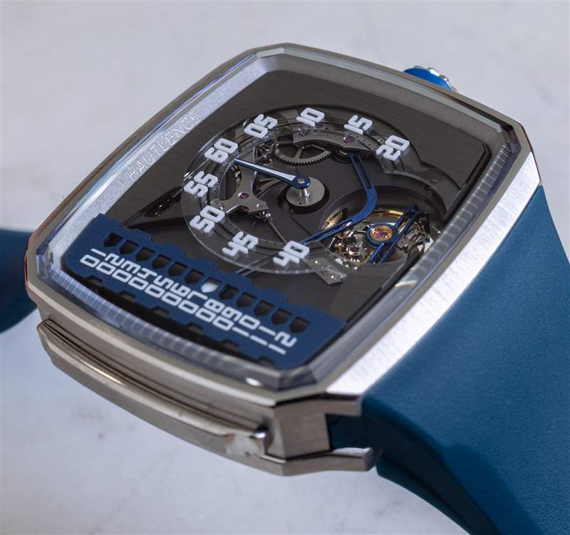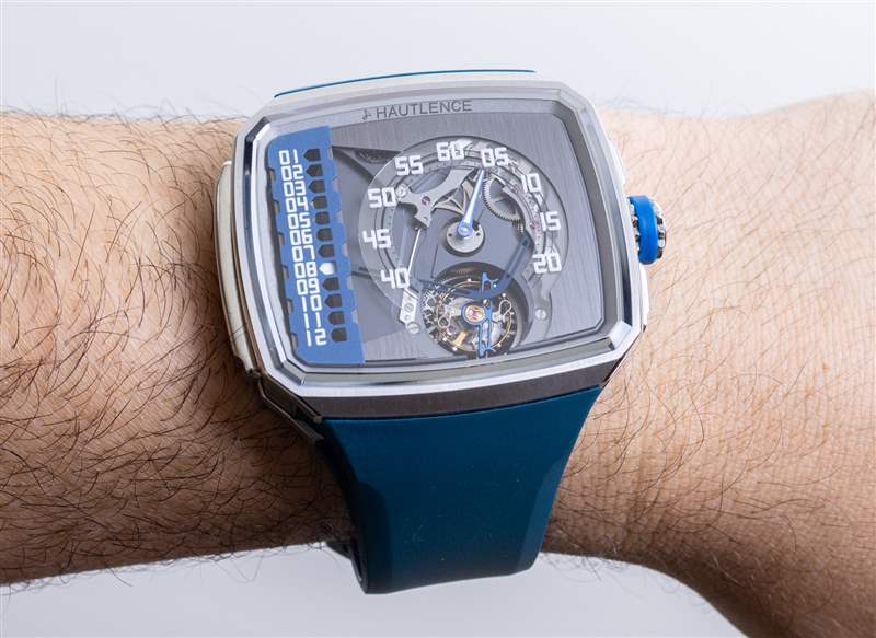 在手腕上,如果您將 Hautlence Linear Series 1 緊貼在您的身體上佩戴,它的重量并不算太差,這可以通過非常高質量的集成橡膠表帶(此處為藍色)來實現。但是帶子對我來說有點長,我無法安全地佩戴。Hautlence 可能為像我這樣手腕較小的人提供較短的肩帶,所以如果您對這件作品感興趣但又擔心確保合身,請務必向公司詢問。