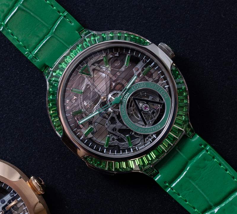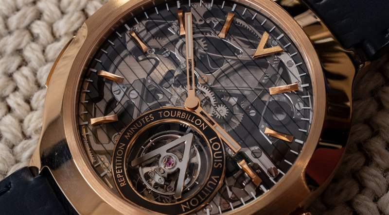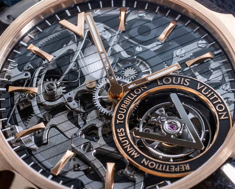 路易威登在日內(nèi)瓦的 La Fabrique du Temps 制造廠是這些手表的設(shè)計(jì)和制造地。那里的團(tuán)隊(duì)擁有大量高復(fù)雜度的經(jīng)驗(yàn),包括各種陀飛輪和報(bào)時(shí)系統(tǒng)。這個(gè)動(dòng)作的執(zhí)行雖然非常傳統(tǒng),但也非常美觀實(shí)用。該機(jī)芯被稱為路易威登 LV100 機(jī)芯,采用手動(dòng)上鏈方式,由 342 個(gè)零件組成。機(jī)芯以 3Hz 頻率運(yùn)行,動(dòng)力儲(chǔ)存長(zhǎng)達(dá) 100 小時(shí)。該機(jī)芯包括帶有秒針的時(shí)間,作為不對(duì)稱放置的飛行陀飛輪調(diào)節(jié)系統(tǒng)的一部分,該系統(tǒng)通過自己的窗口穿過表盤,并配有路易威登“V”形陀飛輪橋板。