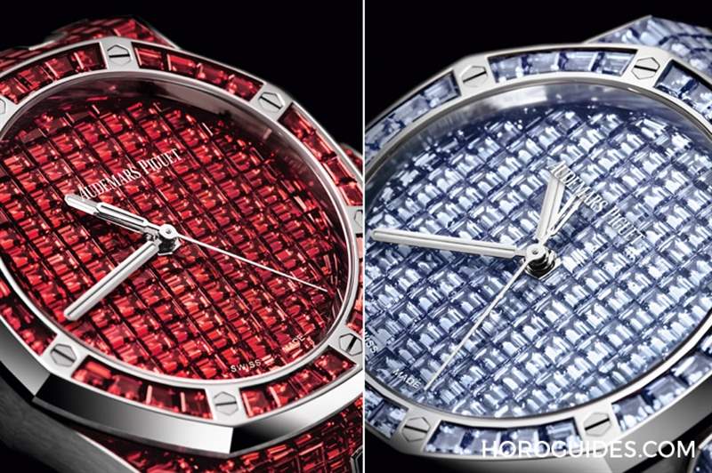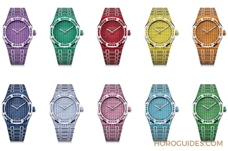 皇家橡樹系列自動上鏈腕表41mm款,鑲嵌寶石包含:紫水晶(左起、上起)、祖母綠、紅寶石、黃色金綠玉、橘色錳鋁榴石、藍(lán)寶石、丹泉石、粉紅碧璽、藍(lán)色黃玉、沙弗萊石。