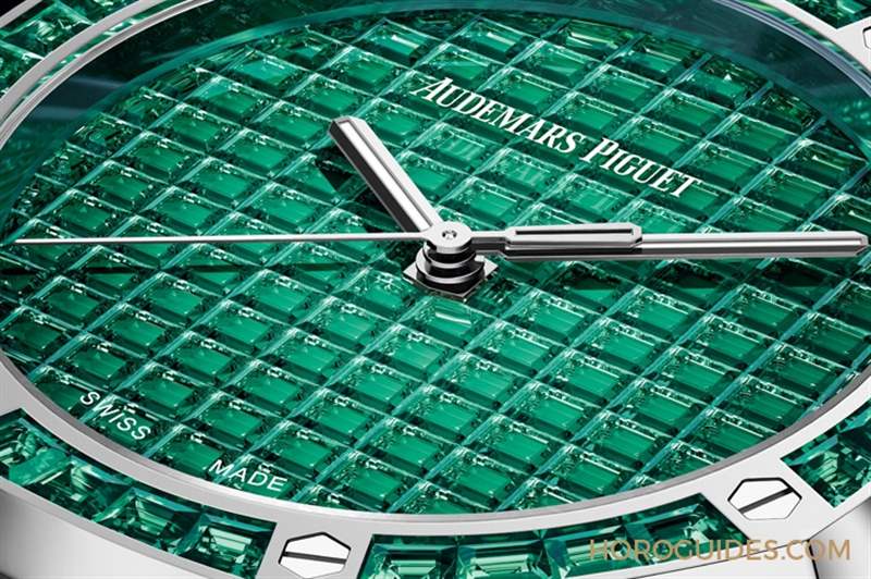 皇家橡樹系列自動上鏈黃色金綠玉腕表,表徑37mm/18K白金表殼/鑲嵌長方形切割黃色金玉綠/5909自動上鏈機(jī)芯/動力30小時/大三針
