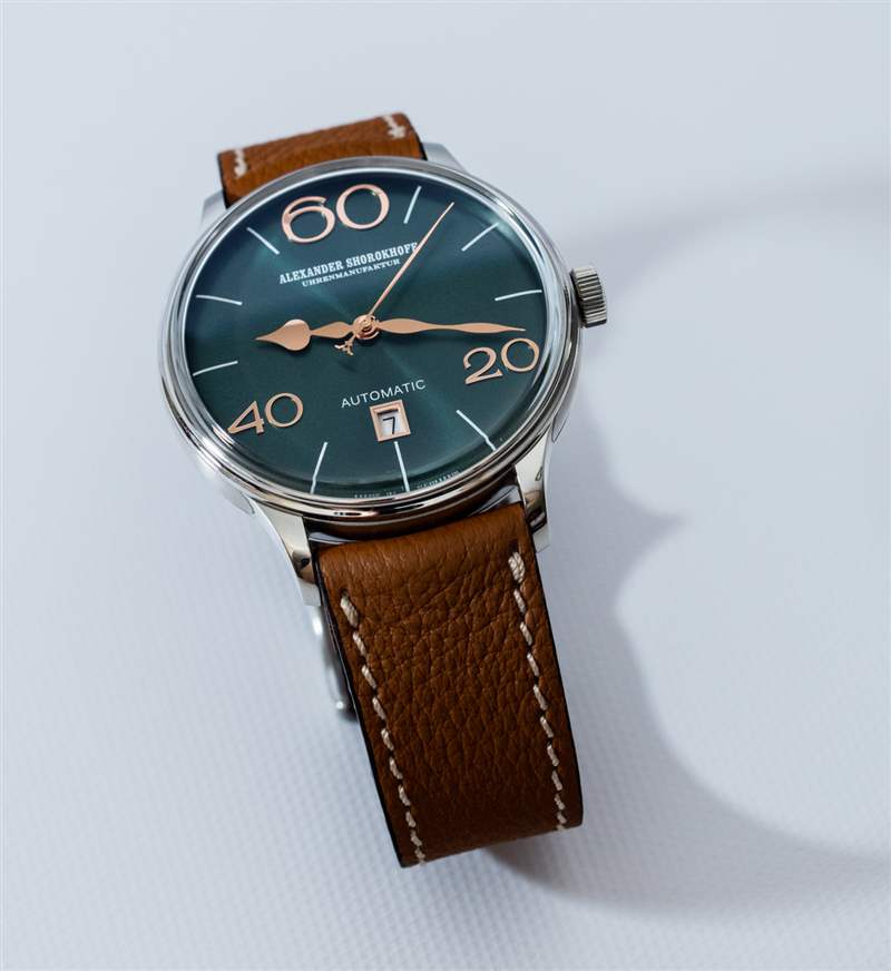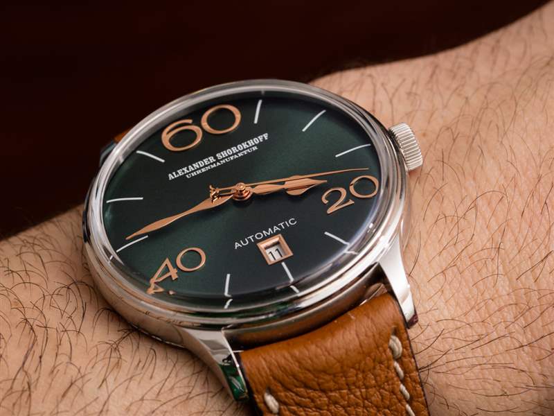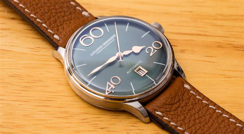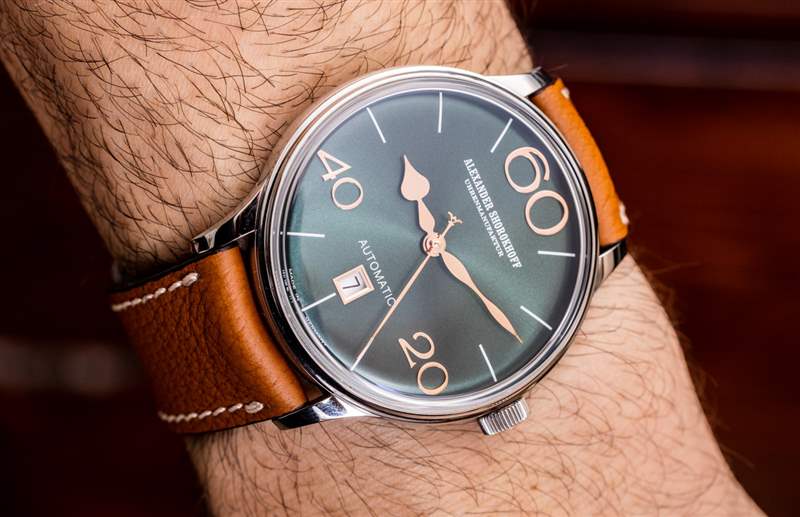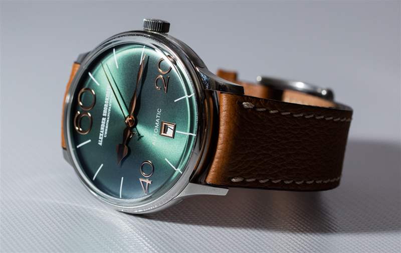 Alexander Shorokhoff 為 Model 63 提供四種表盤顏色,包括圖中的“翡翠綠”、“午夜藍、深黑”和“波爾多”。據我估計,這些顏色中的每一種在搭配盡可能接近表盤顏色的表帶時都會看起來最好,盡管添加黑色或棕色表帶顯然是最保守的選擇。再說一次,我不確定 Alexander Shorokhoff 作為一個品牌是否適合保守的鐘表佩戴者。