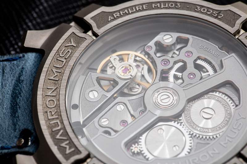 Armure MU03 手表內(nèi)??部是一個非常好看的“制造”自動機芯。此機芯并非由 Mauron Musy 自己生產(chǎn),而是由當?shù)厝鹗抗虨樵撈放粕a(chǎn)的原創(chuàng)機芯。該機芯以 4 赫茲的頻率運行,具有 55 小時的動力儲備,并提供帶有輔助秒針、日期的時間,當然,它是自動的。有趣的細節(jié)包括雙向上鏈系統(tǒng)(不常見)以及迷人的結(jié)構(gòu)和機芯的精加工,它們在匹配 Armure MU03 手表本身的整體美感和主題方面做得很好。甚至像日期盤這樣的元素也是定制的。手表的這種“定制”水平是對有助于解釋價格點的細節(jié)的關(guān)注,作為 10 美元手表的消費者,