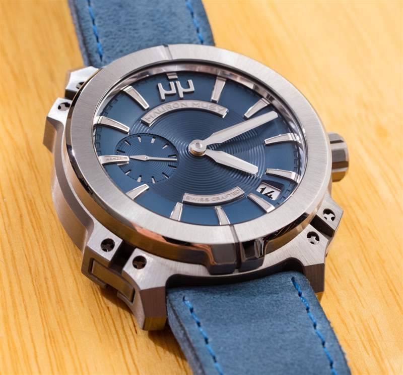Armure MU03 表殼寬 44 毫米,非常突出,但我不會稱它為超大號。精心加工和拋光的鈦金屬表殼戴在手腕上看起來很棒,Mauron Musy 制作了一個特殊的表殼來模仿表盤上表殼的視覺效果。這家公司真的希望您注意它對金屬的加工能力——而 Armure 系列旨在體現(xiàn)其對精細金屬拋光的癡迷。全金屬表盤包括應用時標(每個都經(jīng)過復雜的鉆石拋光處理),以及指針和裝飾表盤(此處為藍色)。癡迷的人會喜歡表盤有一個全尺寸的 9 點鐘指示器,盡管在那個位置有一個輔助秒盤(指針掃過時標中間的一個切口)。
