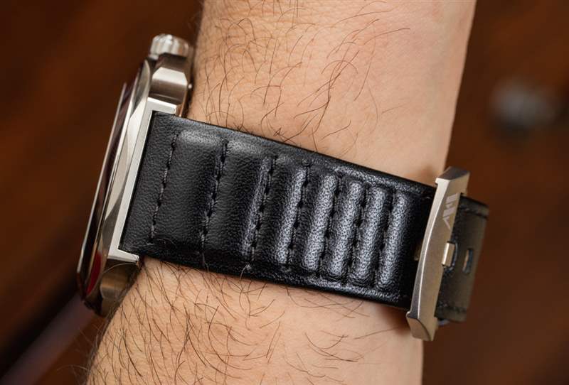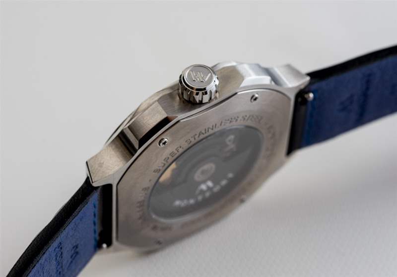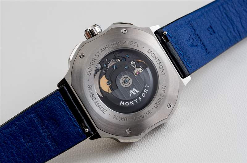 說到表帶,Montfort 使用了一條漂亮的意大利制造的絎縫黑色皮革表帶,內側帶有藍色(在這款手表上)Lorica 襯里。回到這個案例,我發現它做工精良,而且看起來很有趣。雖然案例風格當然不適合所有人,但我相信沒有人可以指責它很無聊。雖然我佩戴這款手表的時間不長,但我相信 Strata 表殼設計肯定會隨著時間的推移而成長。表殼進一步防水 100 米,并在表盤上具有 AR 涂層藍寶石水晶。另一個藍寶石水晶放置在手表后部顯示的機芯上方。