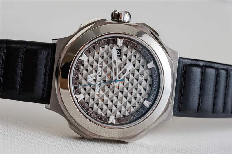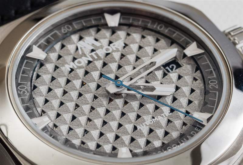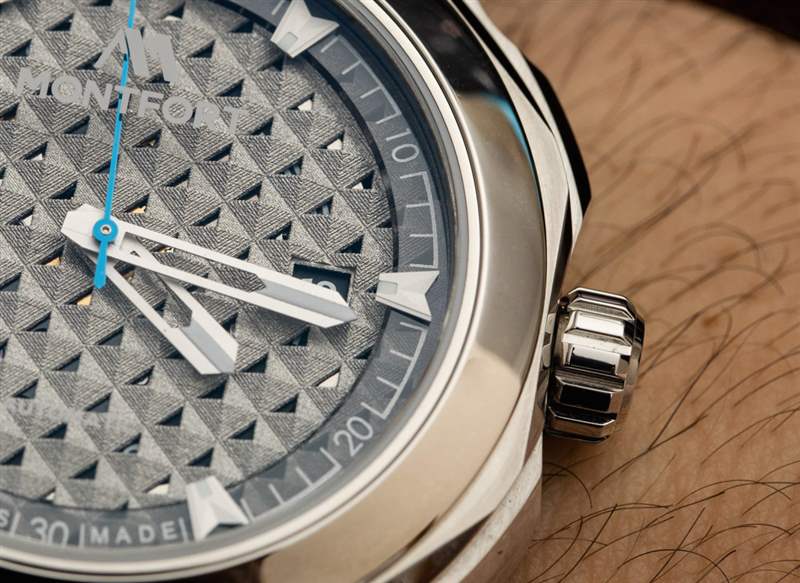 從易讀性的角度來看,表盤上只有 12 個時標,這有點奇怪。從對稱的角度來看,這看起來很酷,但容易讀懂需要一點習慣。Montfort 正確地為大多數指針和時標使用了啞光緞面處理——只使用了一點點發光體就可以很好地測量。顏色通過藍色 PVD ??涂層秒針提供。這實際上是通過 PVD ??應用程序看到藍色秒針而不是經過熱處理、涂漆或電鍍的罕見實例。日期窗口(正確使用黑色圓盤)在 3 點鐘位置可見。