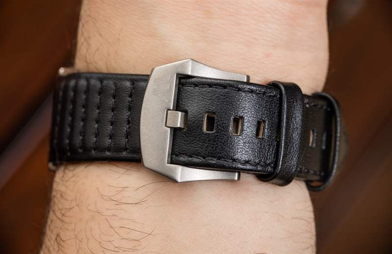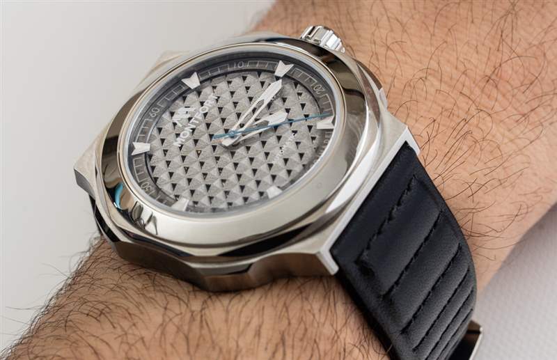 Montfort 自豪地用“超級不銹鋼”制作 Strata 的 44 毫米寬表殼。這是他們對一種特殊硬化鋼的名稱,這種鋼的表面密度比其他標準鋼表更高。實際結果是表殼比類似的鋼表更耐刮擦。表殼的磨損比它可能暗示的 44 毫米寬尺寸要小一些,這是因為它的厚度剛剛超過 10 毫米,以及相對較短的(寬度)47 毫米的凸耳到凸耳的距離。此外,由于表耳的樣式,折疊的地方沒有長長的“角”伸出。