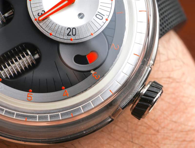 假設(shè)表盤顏色正確,大多數(shù) HYT 手表的時間顯示布局也非常清晰易讀。至少我發(fā)現(xiàn) HYT H0 Silver 就是這種情況,我在本次評測中與 H0 Orange 一起評測了它。我仍然不知道為什么 HYT 決定使用“0”名稱。為什么不選擇 HYT H5 或類似“H1 Neo”之類的東西呢?也許稱之為H1.5。這款手表可能有一個全新的表殼,但為什么要使用 0 作為名稱的一部分呢?我們要回到過去嗎?看起來它被稱為“Ho”的手表值得嗎?無論名稱如何,H0 腕表系列都給人耳目一新的感覺,并且很好地利用了 HYT 在其五年生命周期中開發(fā)的技術(shù)和視覺主題。