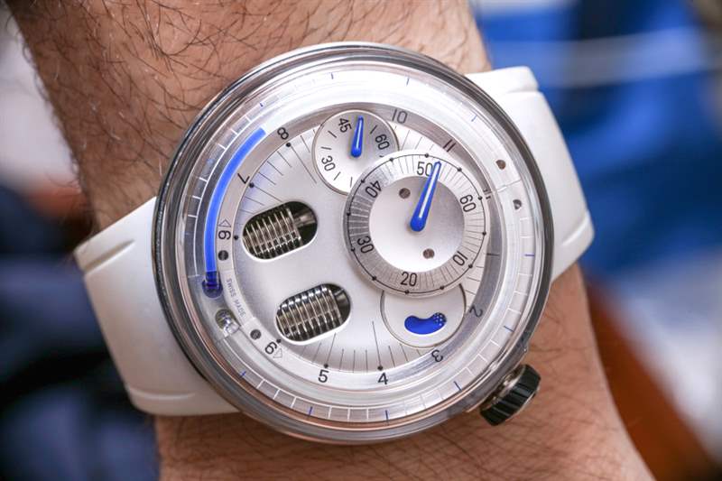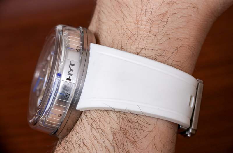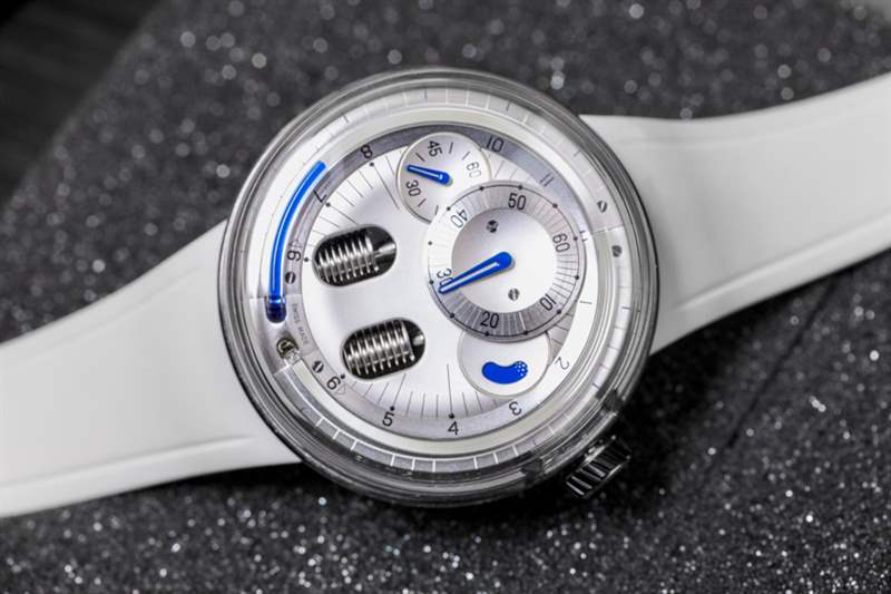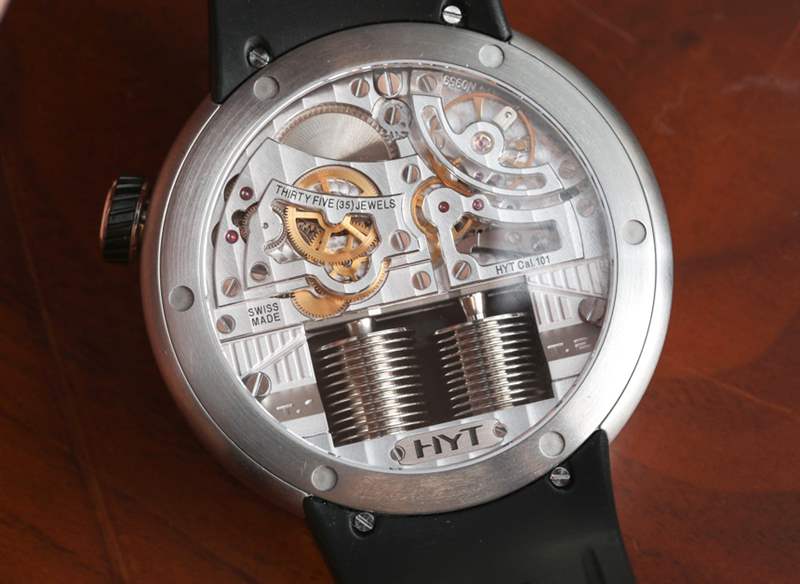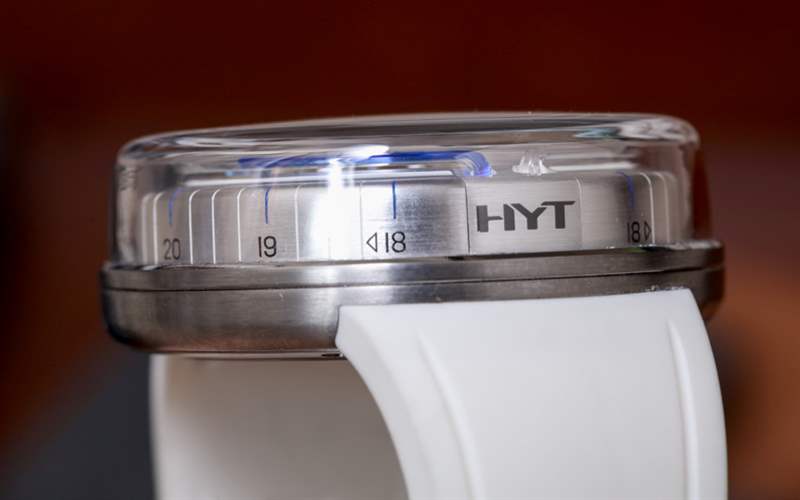 HYT 粉絲當然會喜歡表盤上的兩個橢圓形開口,可以看到控制時標液體運動的金屬波浪。與大多數(shù)其他手表相比,更改時間的過程稍慢,但在與大多數(shù)傳統(tǒng)手表機制不同的 HYT calibre 101 機芯中,這一點值得尊重和理解。
